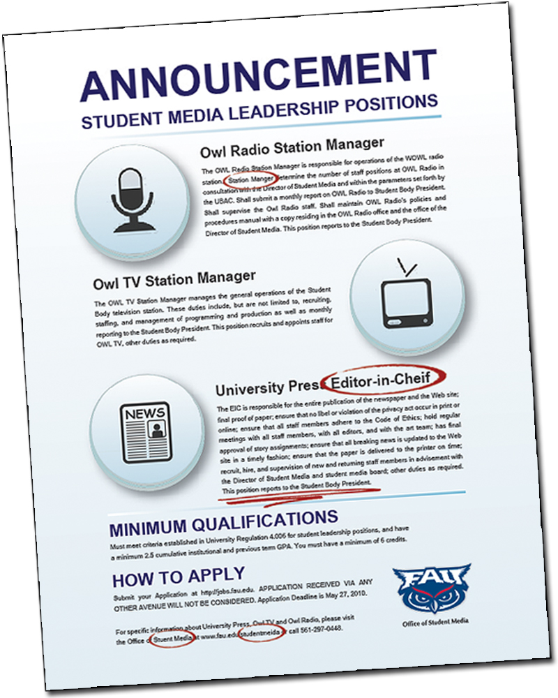 Alas, FAU administrators didn’t do that on Friday, when they posted fliers for editor of the student newspaper and station managers for both the TV and radio station. (That’s the flier above.)