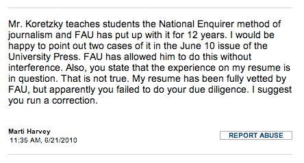 The woman who fired me then changed her tune and posted this comment on one of those newspapers’ sites: “Mr. Koretzky teaches students the National Enquirer method of journalism and FAU has put up with it for 12 years.”