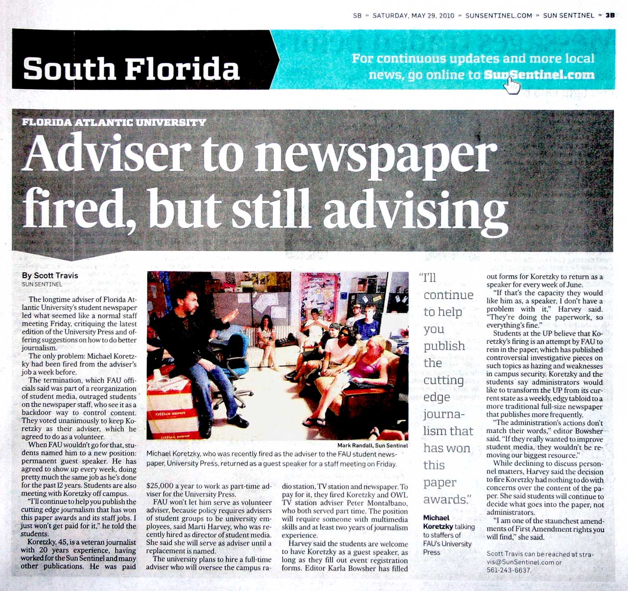 I was fired from FAU after years of warnings. The student journalists had, with my permission and encouragement, forced an embezzling student body president to resign, snuck into the dorms to highlight lax security, proved hazing still happened on campus, and covered a student death despite a campus lockdown, among other stories that irked administrators.