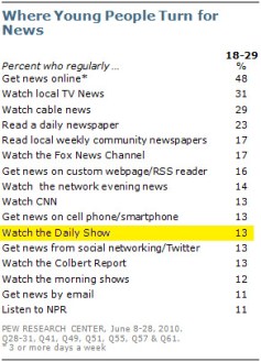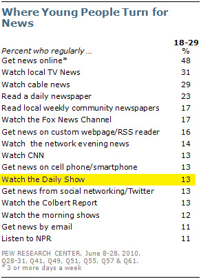 Onstage, I asked Haglund and Parang about studies that show college students get their news from the Daily Show. A Pew Research Center study in 2010 claimed, “About as many young people regularly watch the Daily Show (13%) and the Colbert Report (13%) as watch the national network evening news (14%) and the morning news shows (12%).”