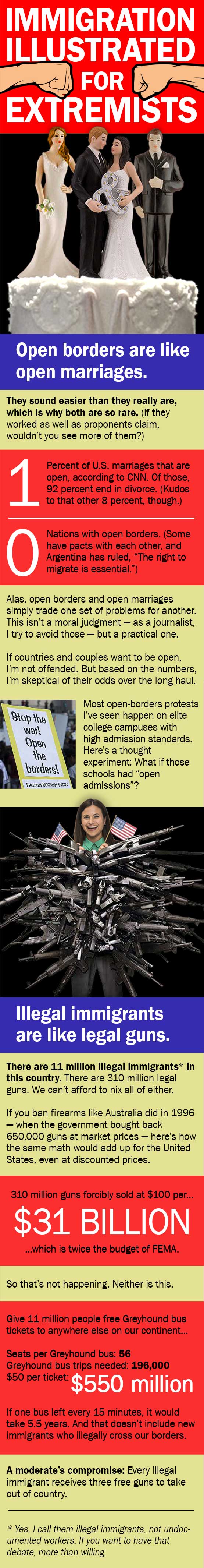 That’s fine, except when I’m confronted by extremists, who bore me. Especially about immigration. They’ve memorized their favorite stats – about open borders on the left, mass deportation on the right – and they attack instead of address any contrary claims.