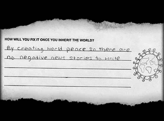 1. Lauren, 17, would do it “by creating world peace so there are no negative news stories to write.” Then she drew a globe with everyone holding hands. See above.
