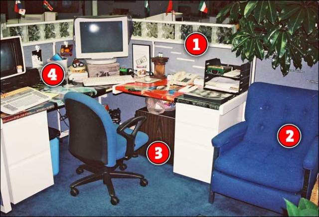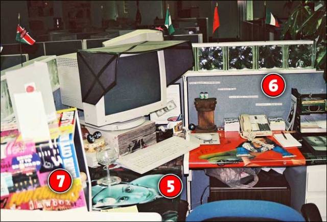 No. 1: Glass block on top of the cubicle walls, with flags of several nations protruding randomly, for no good reason.
